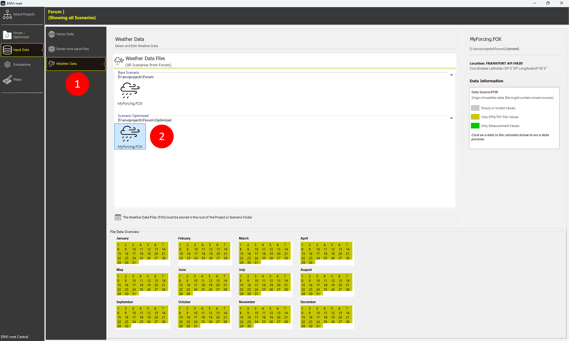 Under Input Data, click on Weather Data (1) to browse all available weather data files of your scenarios (2).