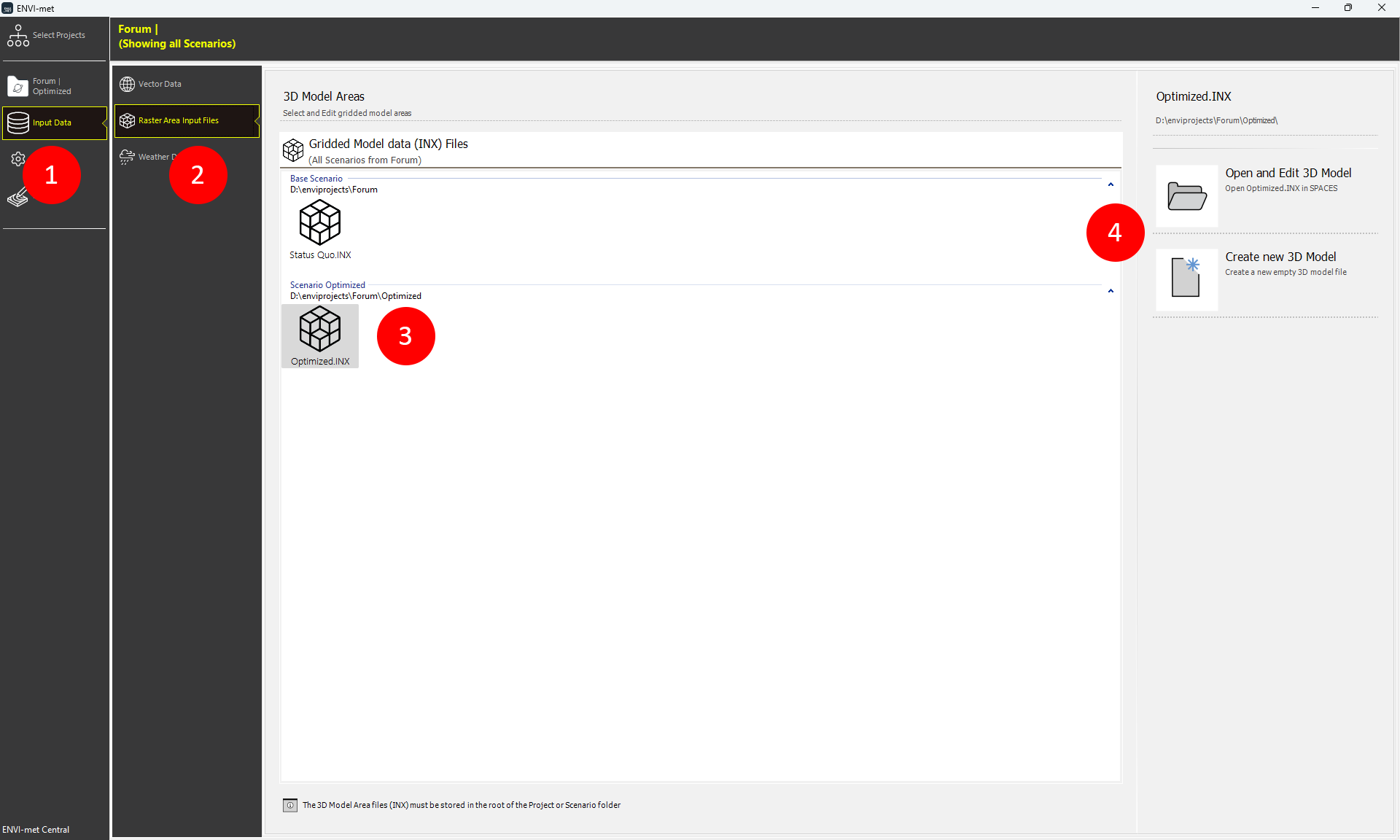 Click on Input Data in the sidebar (1) and then click on Raster Area Input Files (2). All available model area versions will appear in the middle (3), sorted by their respective scenario. You can select and edit an existing model area or create a new one for your respective scenario (4).