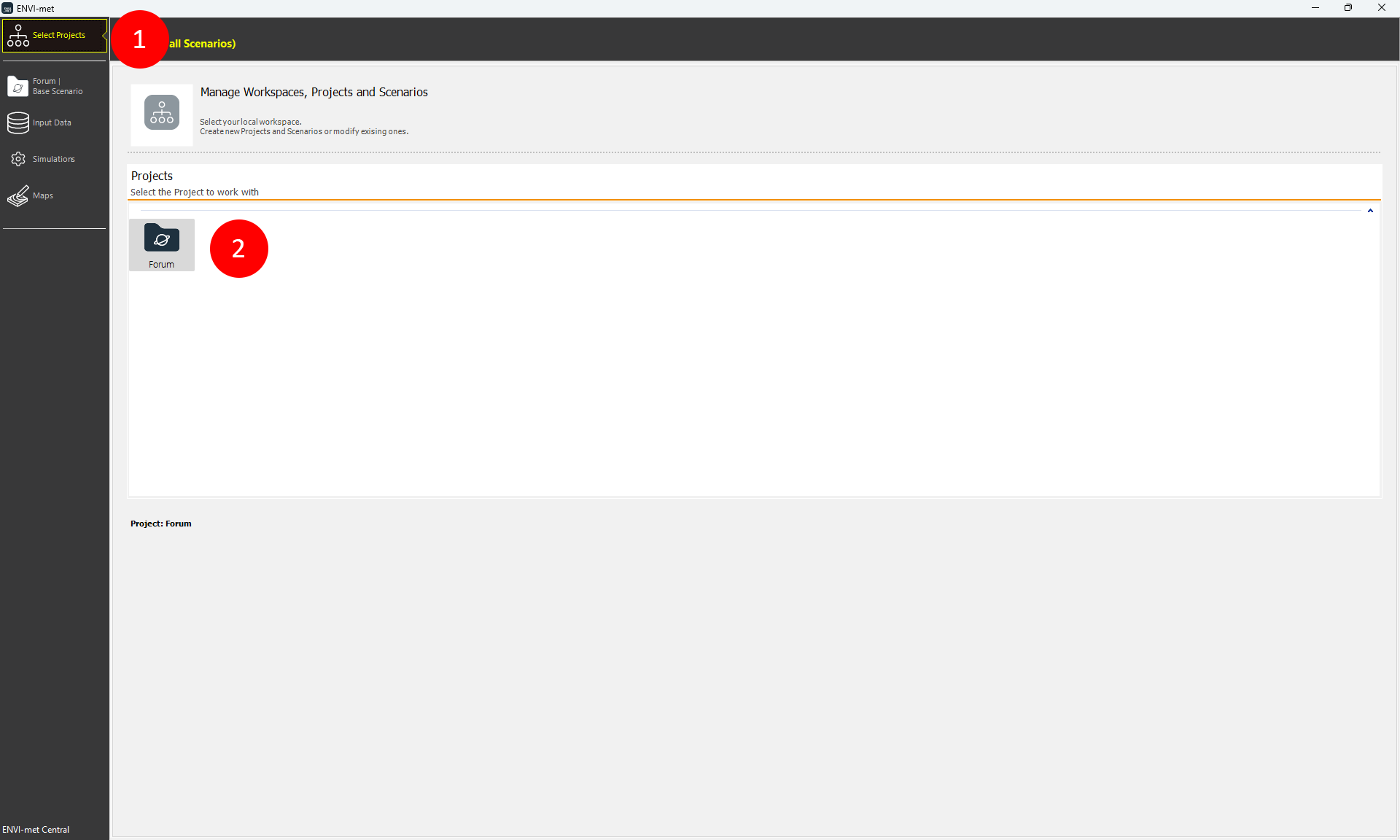 Click on your Project in the sidebar (1). The available scenarios will appear in the bottom (2).