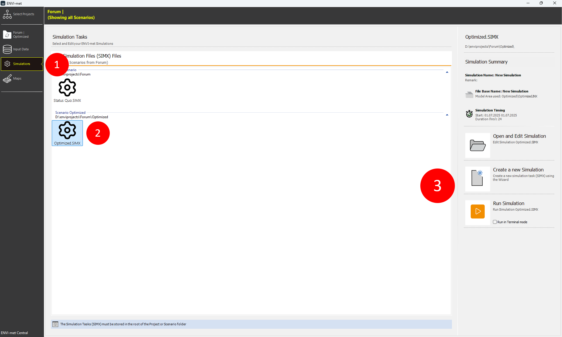 Click on “Simulations” (1) in the sidebar. You can browse all available simulation configuration files of your scenarios (2) and either open and edit the selected simulation file, create a new simulation file or start the selected simulation directly from the central (3).